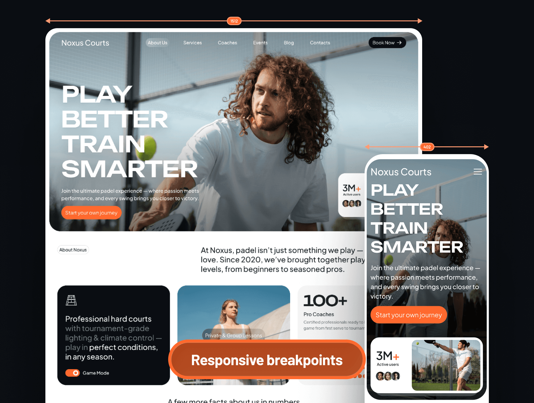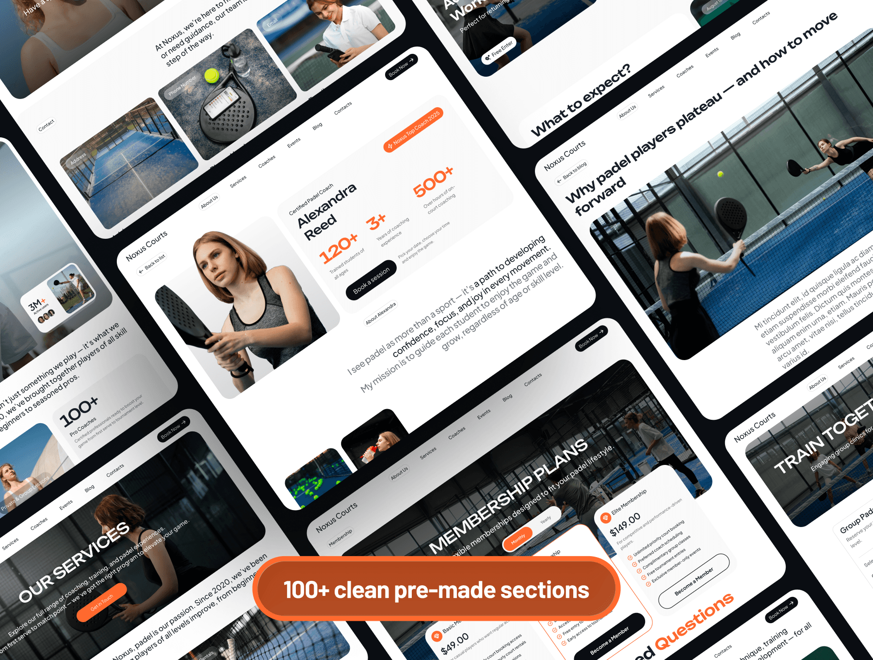 Noxus Court is a comprehensive, production-ready website solution designed specifically for padel clubs, tennis facilities, and sports venues. This meticulously crafted UI kit includes 60+ fully designed screens and 100+ pre-made sections with both light and dark themes. Built with a robust design system featuring 800+ Figma variables, it streamlines the creation of modern, conversion-focused websites for membership plans, booking flows, and event management.